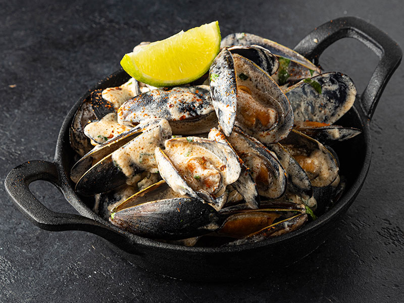 Мидии киви, сливки, соус чкмерули, чеснок, сыр сулугуни, специи